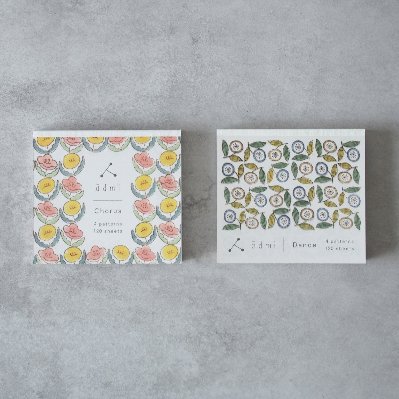 ChorusとDanceの2種類で、それぞれChorus / Sky / Apple / Season、Dance / Days / Trip / Konoha の4柄入り。たっぷり使える120シート。しっかりと厚みのある紙を使用しているため、裏移りしないのもポイントです。
