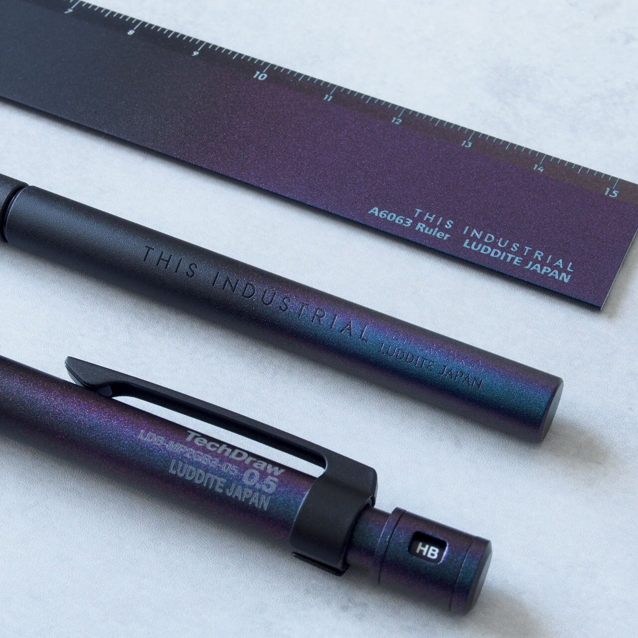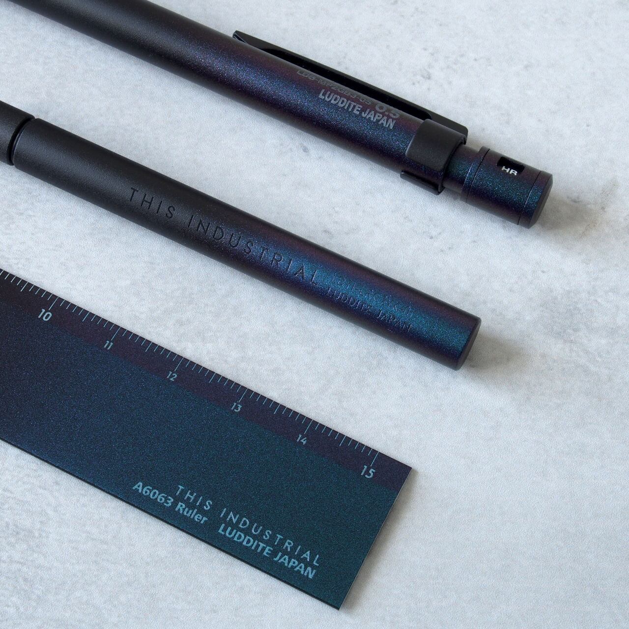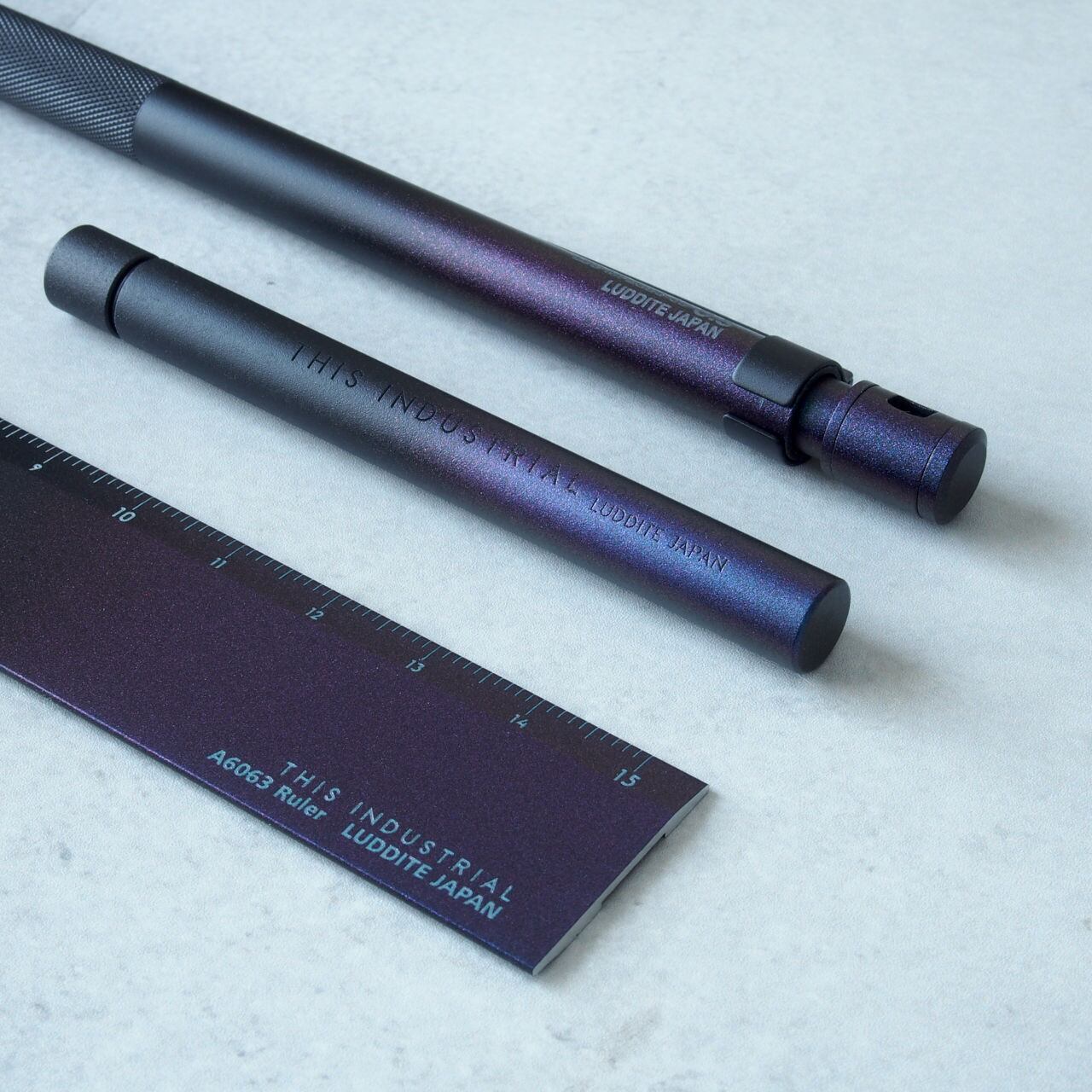 パウダーコーティングされたアルミ製定規。裏面の凹凸と傾斜により、指一本で軽く浮かせ、持ち上げられます。日本ペイントが開発・販売する分光性塗料 “マジョーラ” をグラデーション塗装し、見る角度によって紫やブルーに変化する美しい軸色が特徴です。
