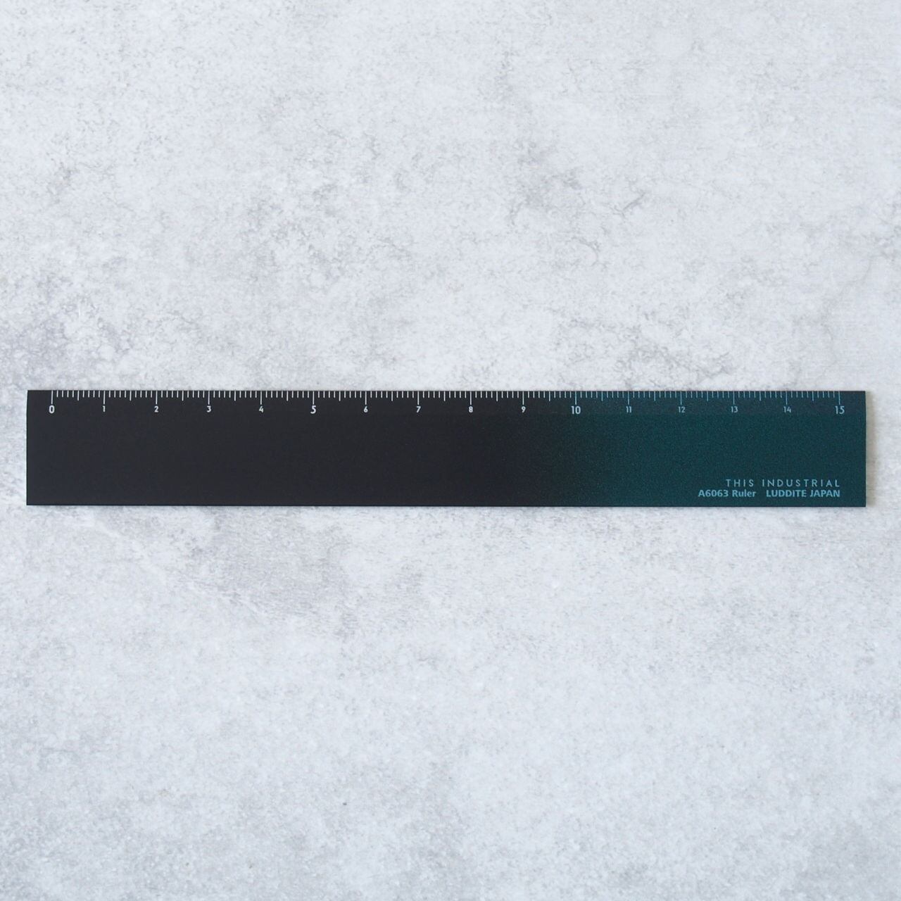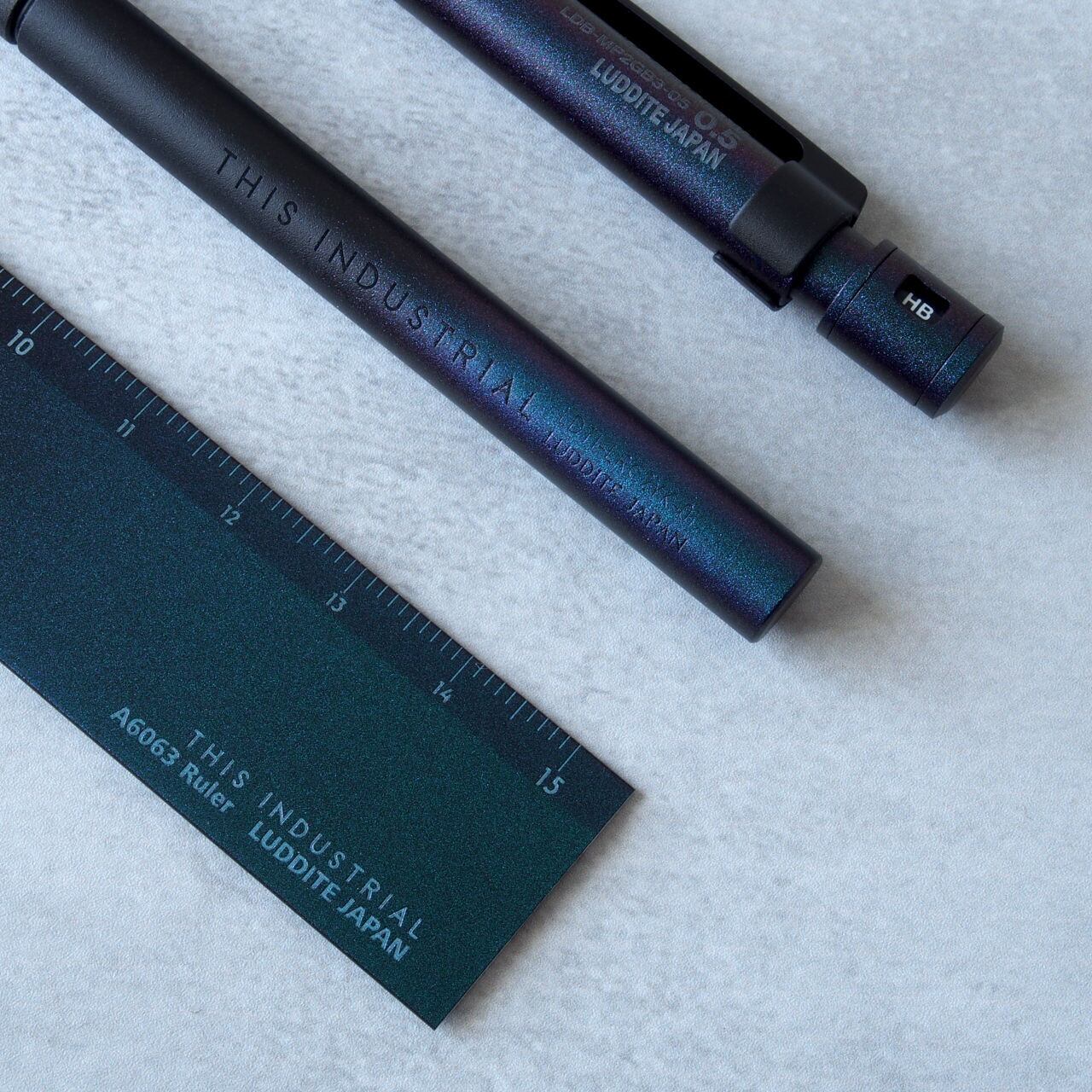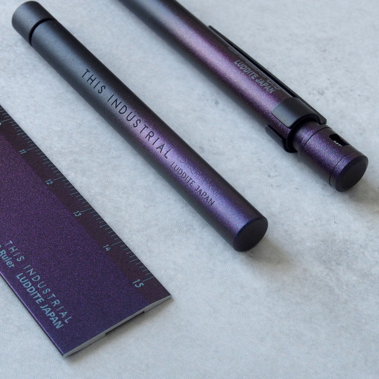 パウダーコーティングされたアルミ製定規。裏面の凹凸と傾斜により、指一本で軽く浮かせ、持ち上げられます。日本ペイントが開発・販売する分光性塗料 “マジョーラ” をグラデーション塗装し、見る角度によって紫やブルーに変化する美しい軸色が特徴です。