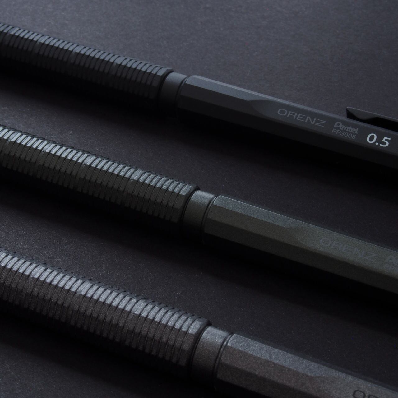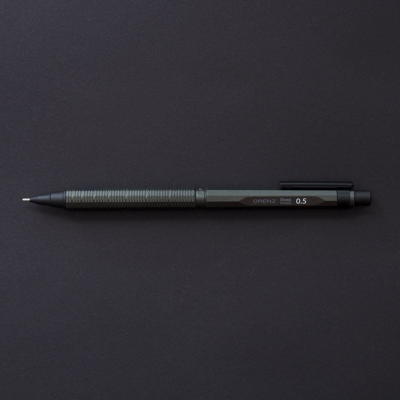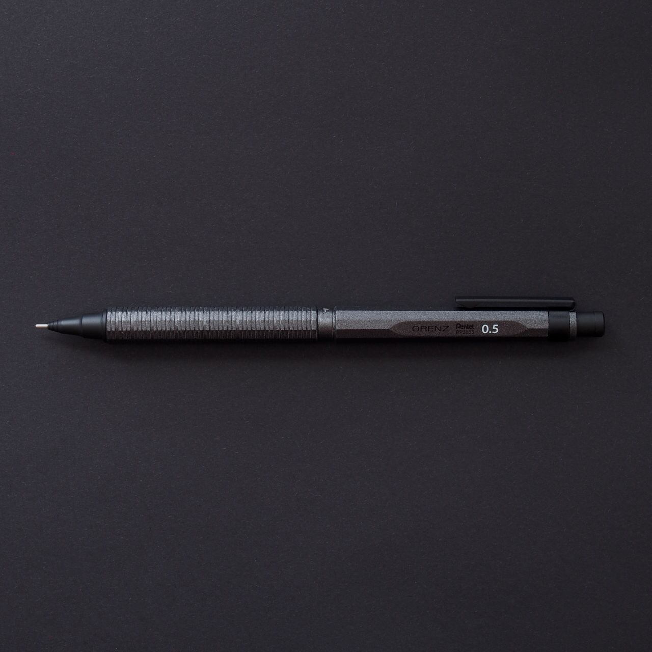 金属製替芯ケースは、オレンズネロのデザインコンセプトである、“塊から削り出したような一体感”を追求し、ぺんてるの自動芯出し機構搭載のシャープペンシルのアイデンティティを継承した、重厚感のある12角柱のフォルム。