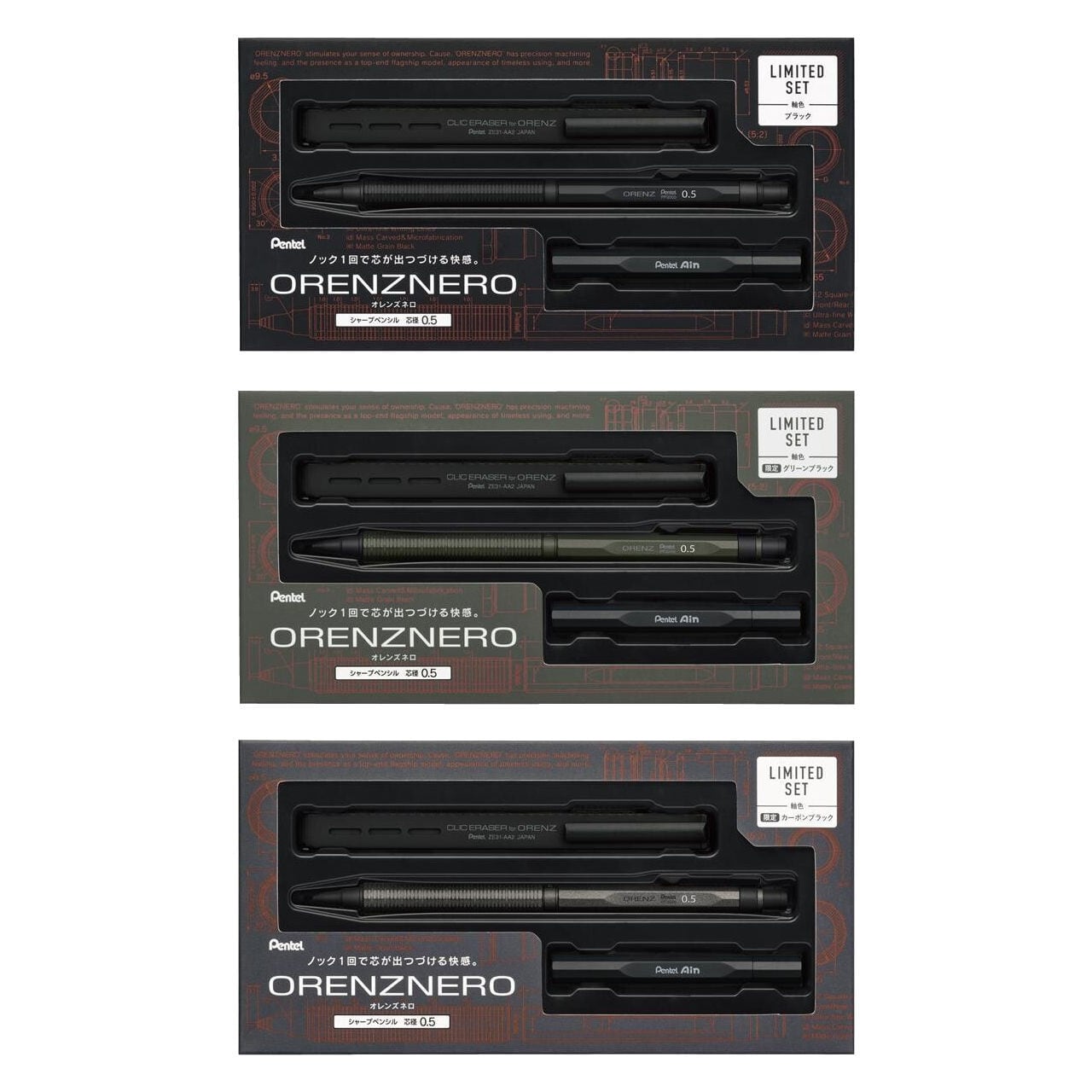 オレンズネロの「所有感」や「存在感」といった世界観を継承し、名前の由来である「黒(NERO)」にこだわった、限定カラー2色を含む限定セットが登場。ラインナップは、定番の「ブラック」、静けさと深みのある「グリーンブラック」、ぺんてるが誇る高品質なシャープペンシル替芯を想起させる「カーボンブラック」の3種類。