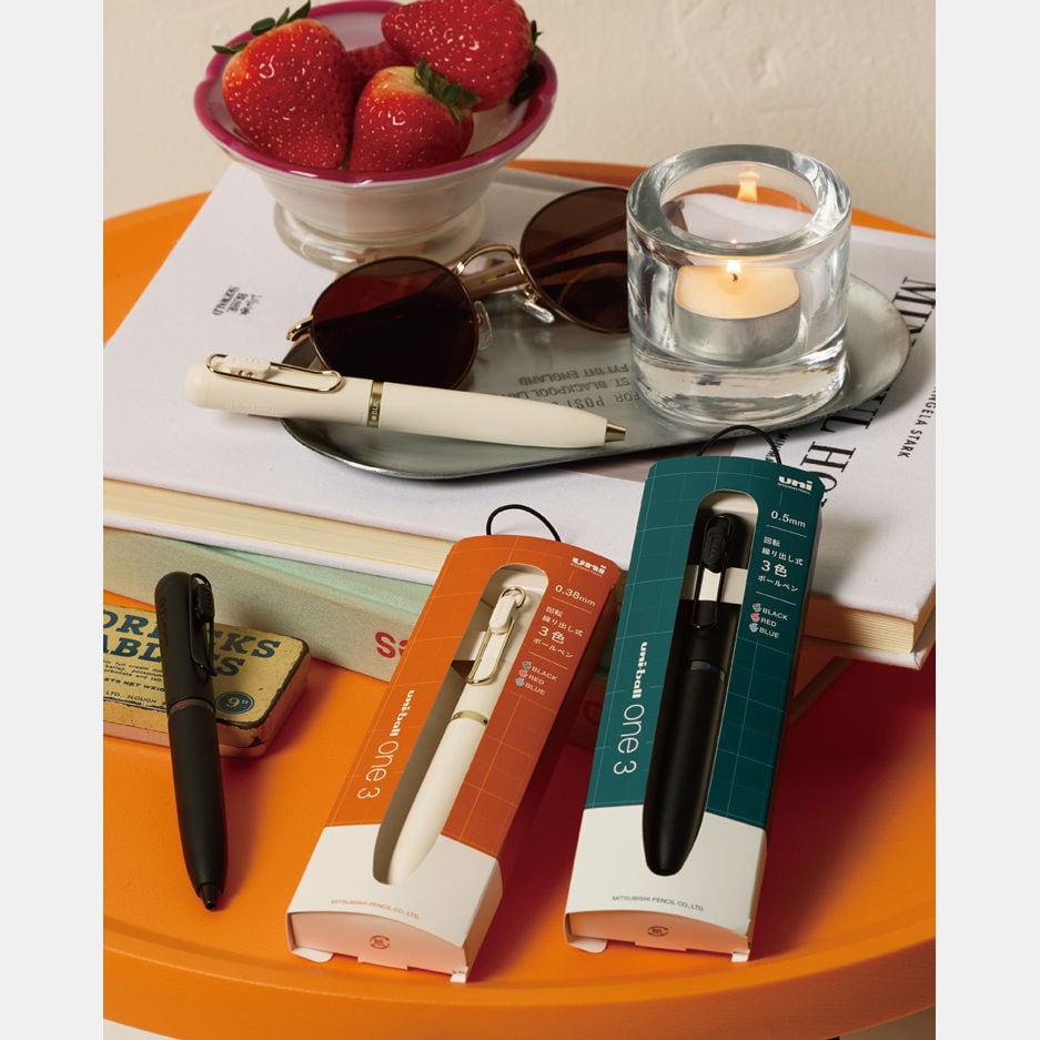 三菱鉛筆の人気ボールペン「ユニボール ワン」から、3色ボールペンが登場。黒、赤、青のスタンダードな3色を搭載し、短寸・太軸でかわいらしいフォルムながら、手に馴染みやすく書きやすい形状です。金属製の口金(スタビライザー機構)を搭載することで、安定したなめらかな書き味を実現しています。